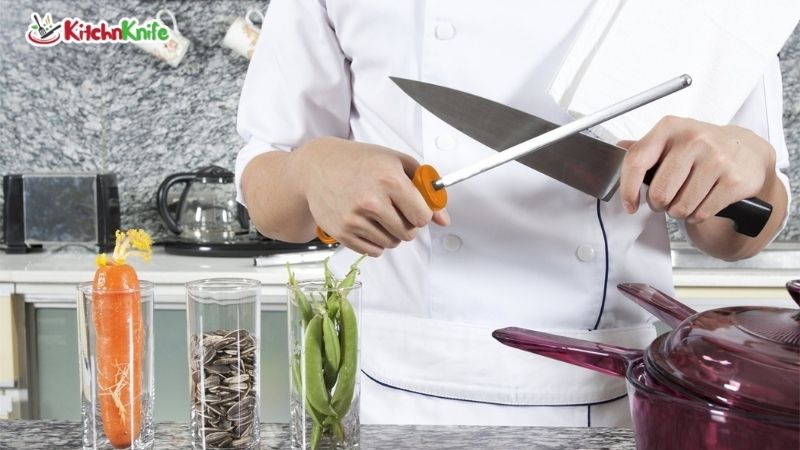 Chef’s Knives: These are easiest to sharpen. The straight edge works perfectly with steel rods. Use 10 strokes per side.